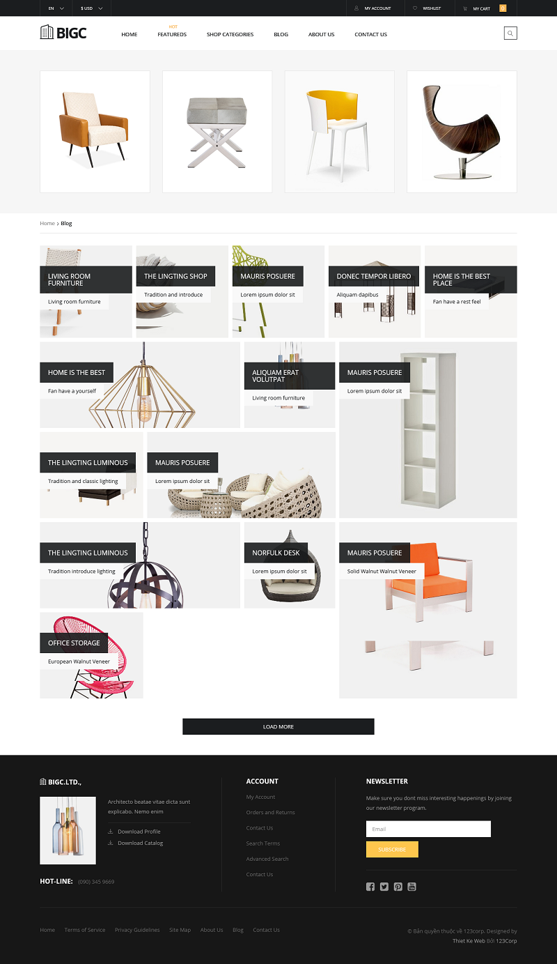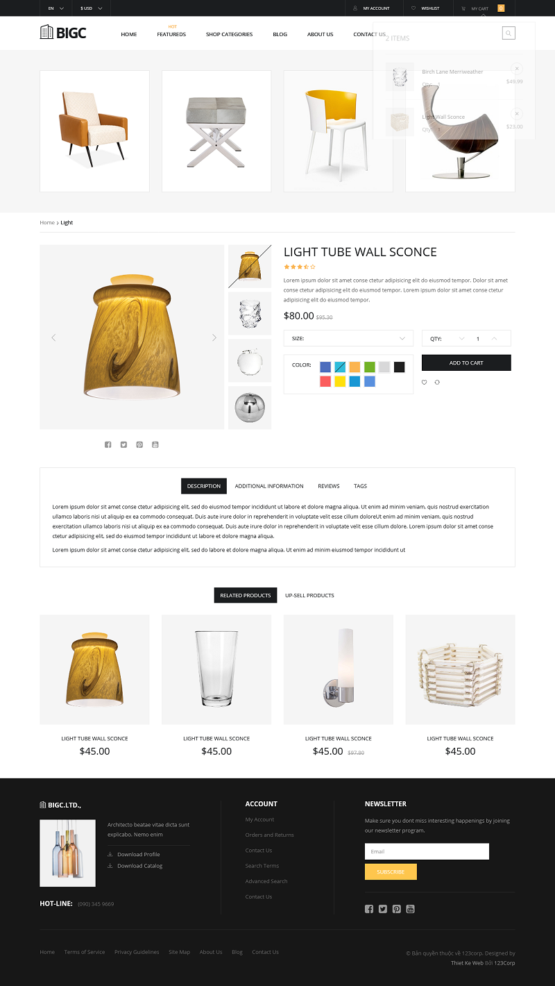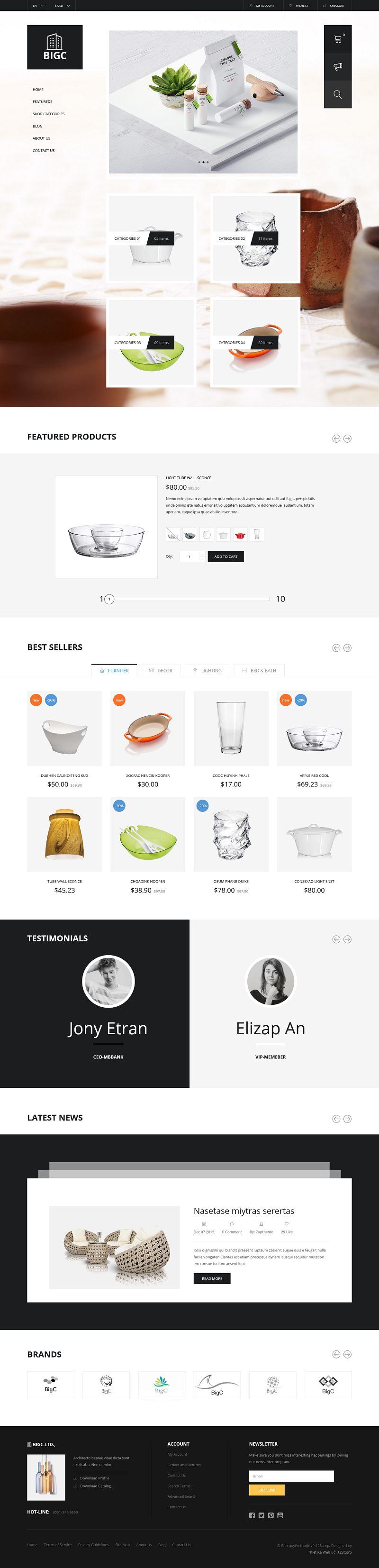 Với giao diện chuyên nghiệp, hệ quản trị dễ sử dụng, được phân chia theo danh mục rõ ràng giúp người dùng dễ quản lý và tìm kiếm, mẫu website bán hàng BigC này thật sự là lựa chọn hoàn hảo cho những doanh nghiệp kinh doanh các mặt hàng như: nội thất, thời trang, trang sức, mỹ phẩm, giày dép,.... Giao diện được tích hợp sẵn tính năng Responsive giúp hiển thị tốt trên mọi thiết bị, code tay chuẩn SEO là một ưu thế trong thiết kế website tại 123CORP.